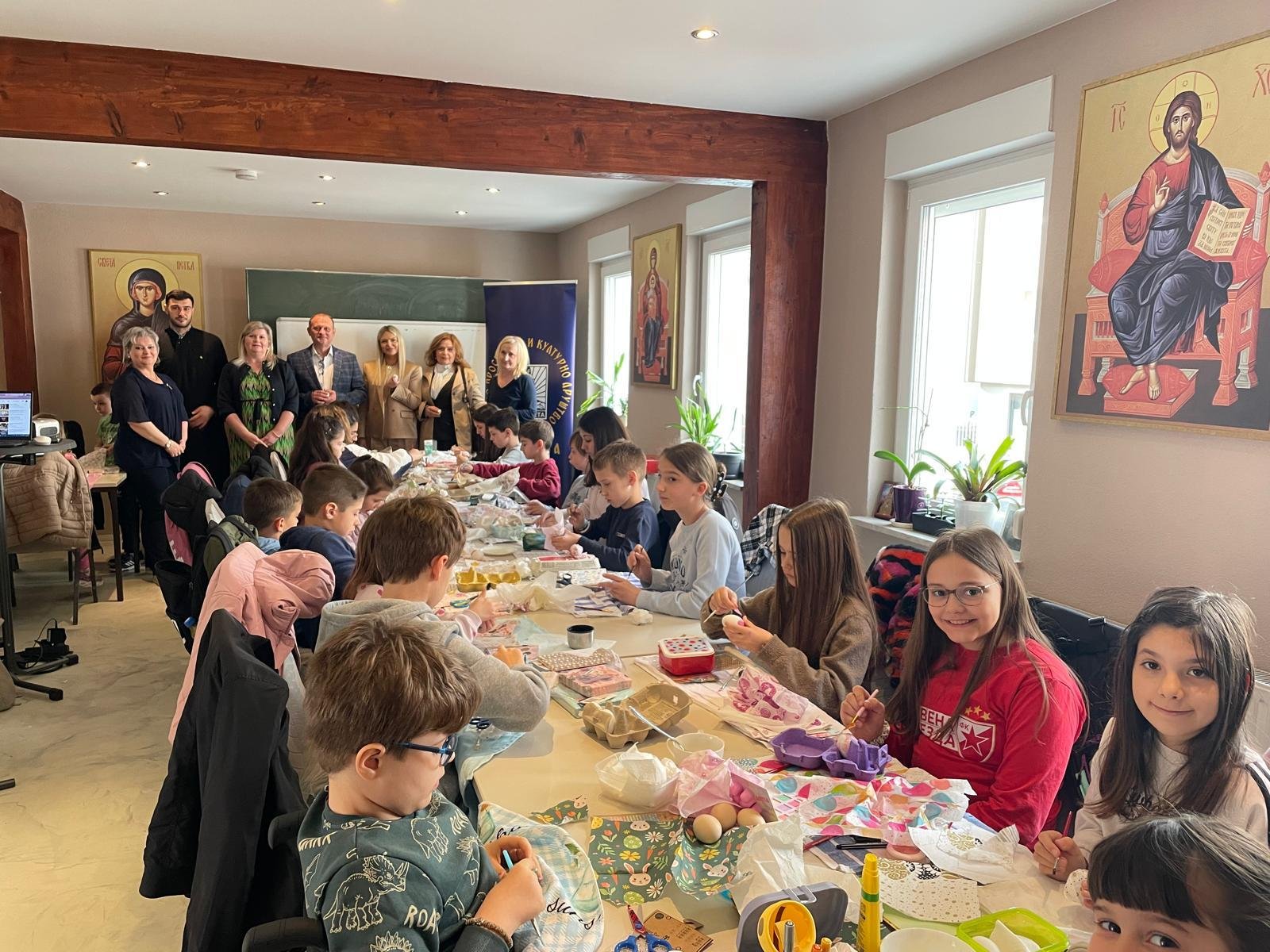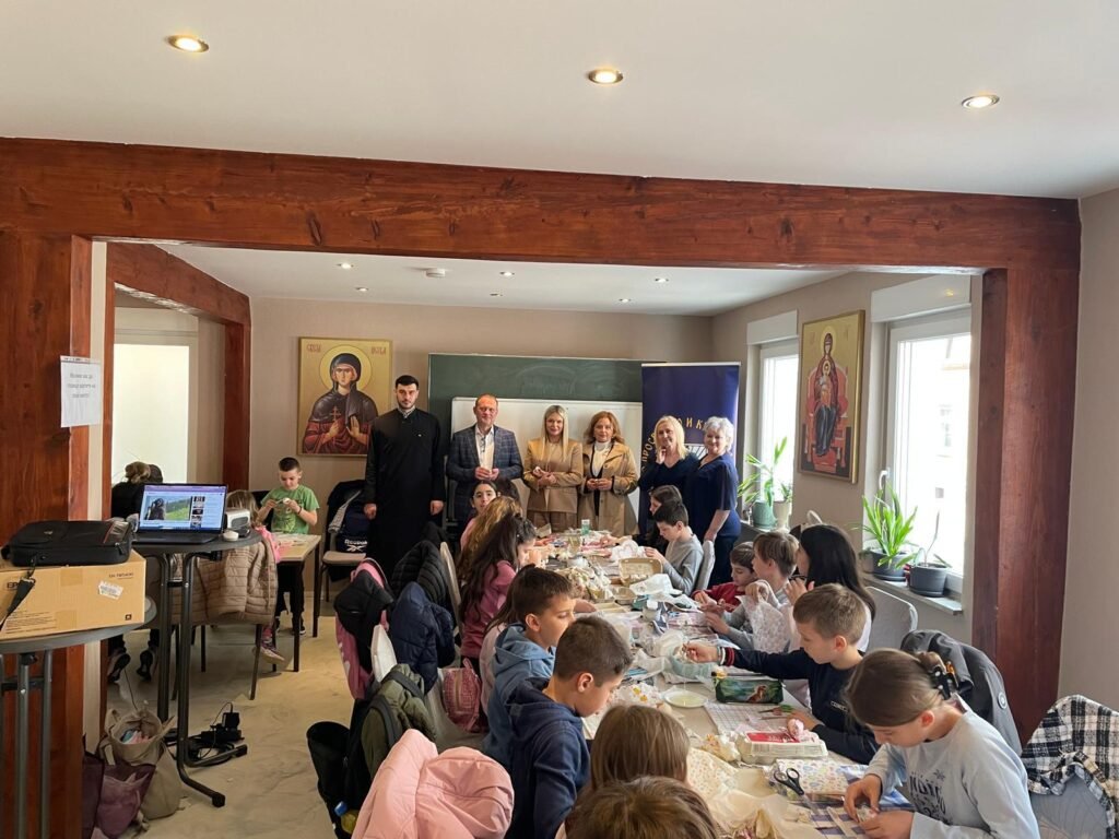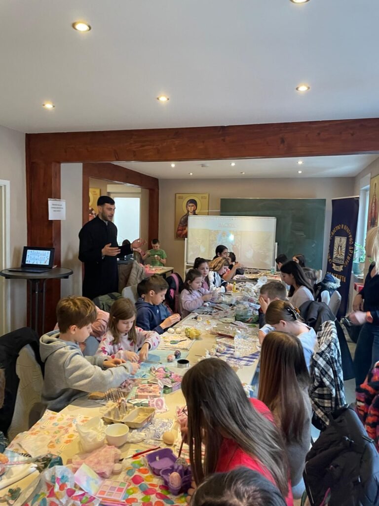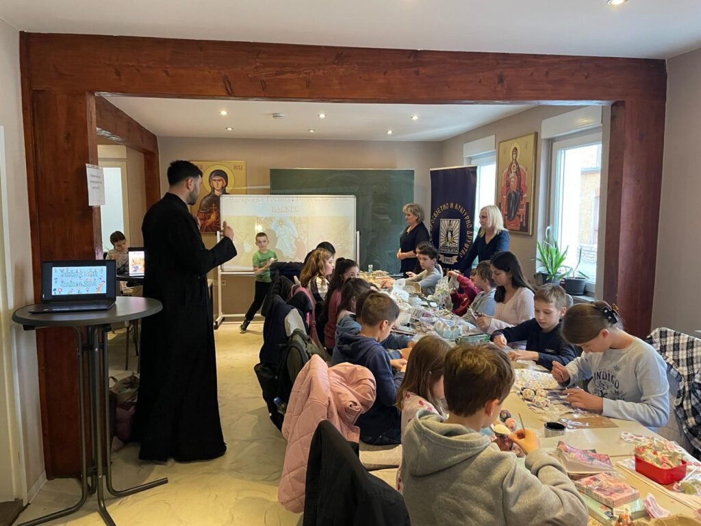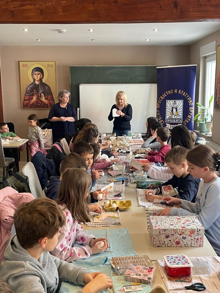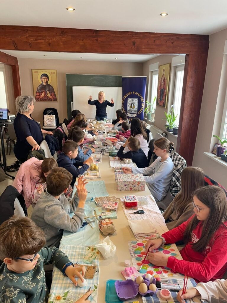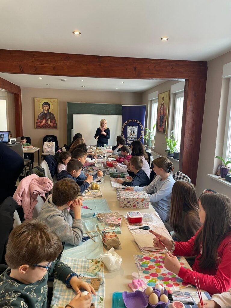 Radionica je osmišljena kao prostor učenja, stvaranja i druženja, ali i kao prilika da se djeca podsjete na važnost tradicije i vjere u očuvanju srpskog identiteta u dijaspori. U prvom dijelu radionice đakon Marko Kolović govorio je o Vaskrsu, njegovom značaju i običajima koji prate ovaj najveći hrišćanski praznik. Potom su učiteljice srpske dopunske škole vodile kreativni dio – ukrašavanje jaja, kao i obuku u dekupaž tehnici.